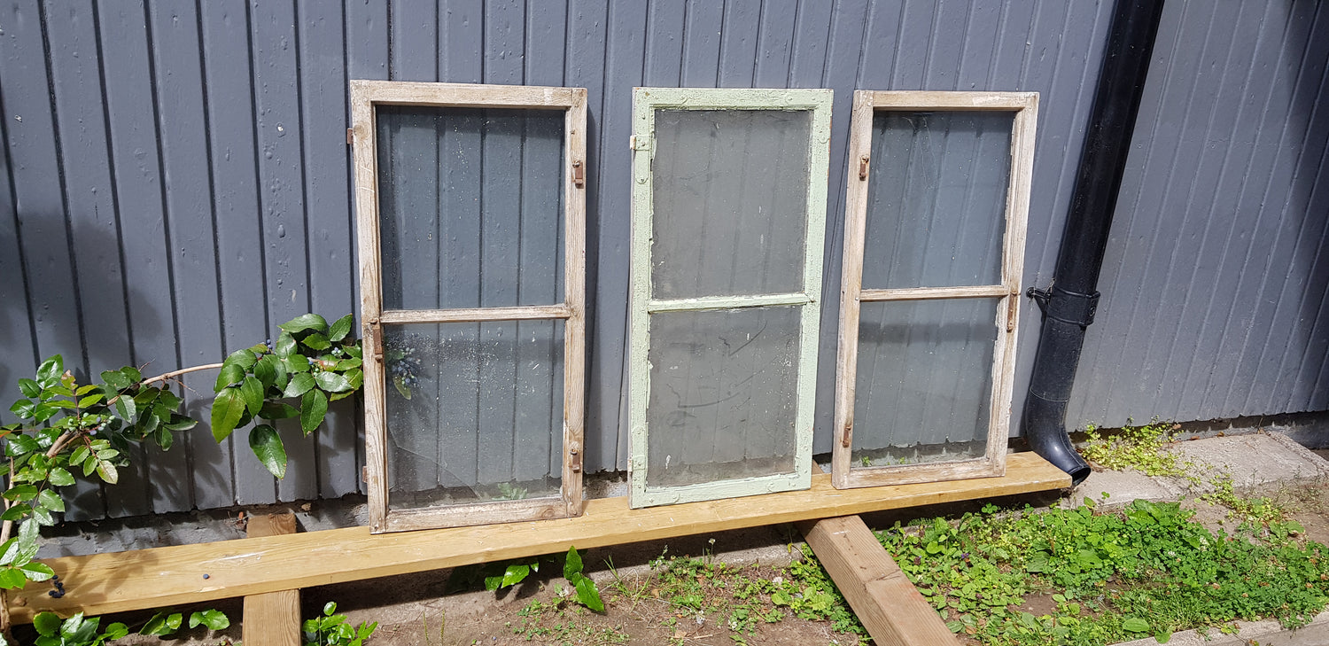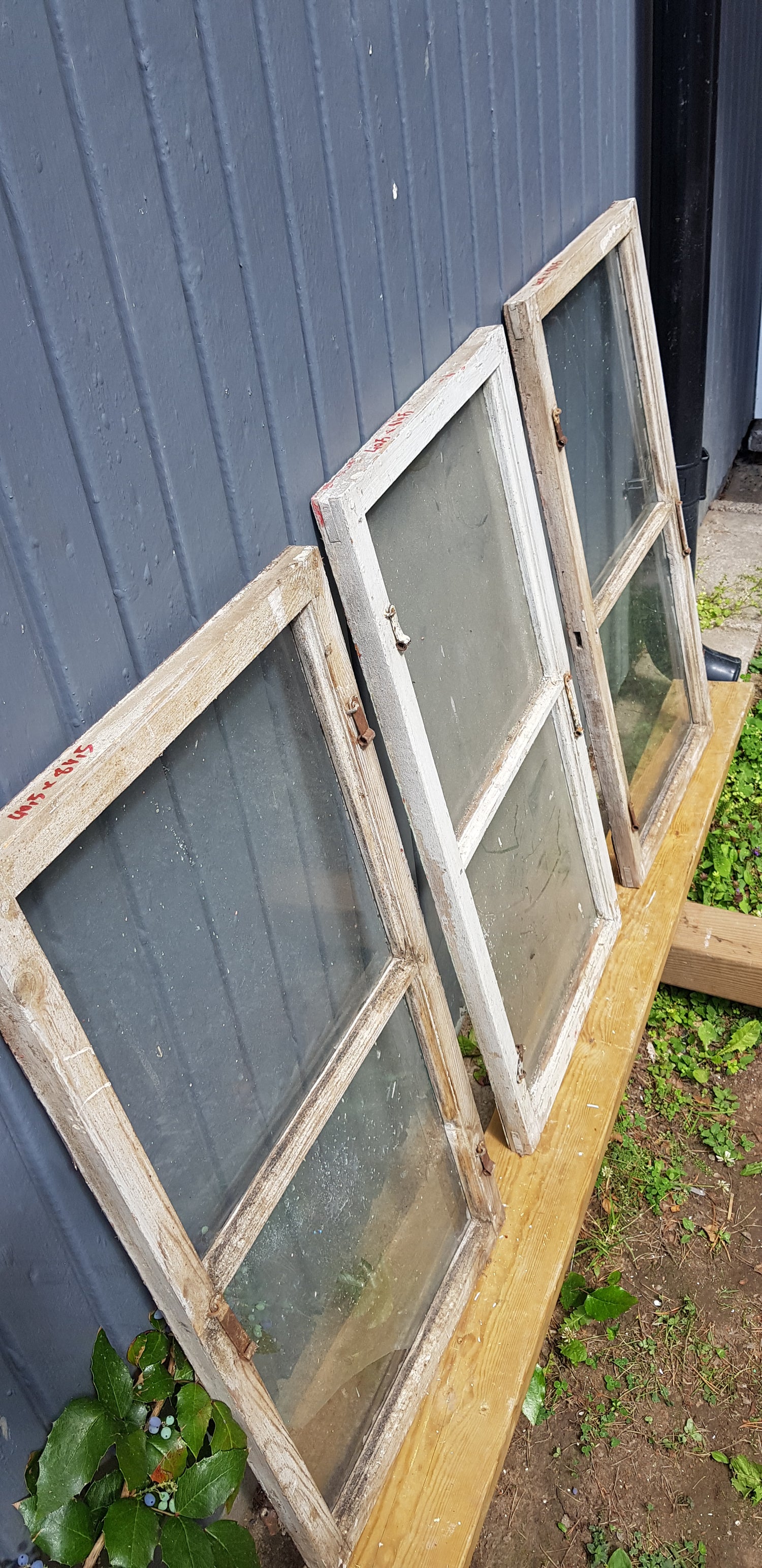 3 st Äldre spröjsade fönster med äkta spröjs utan karm med munblåsta glas. Perfekt till växthus eller uterum. Mått: Bredd 40.5 cm Höjd 84.5 cm tjocklek 3 cm