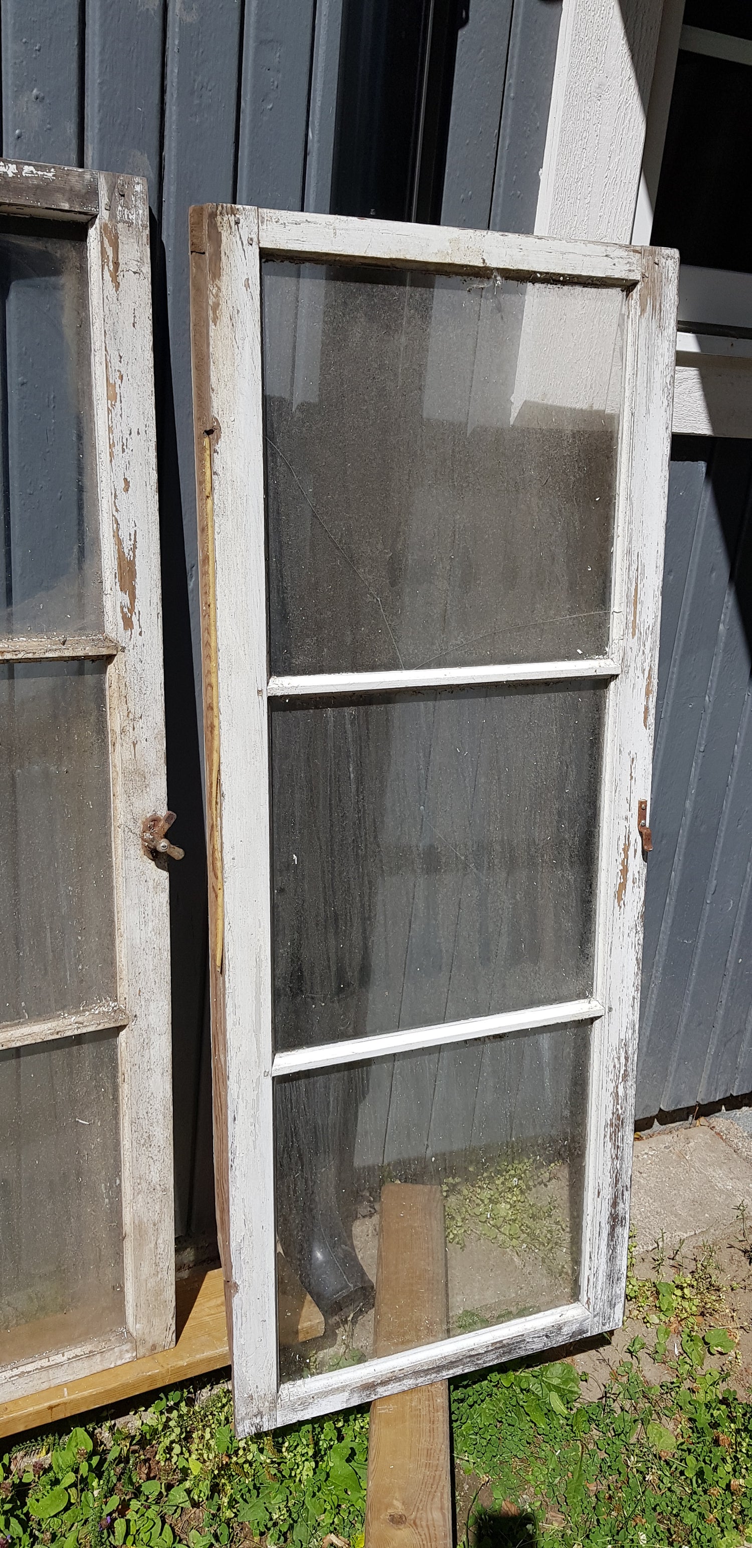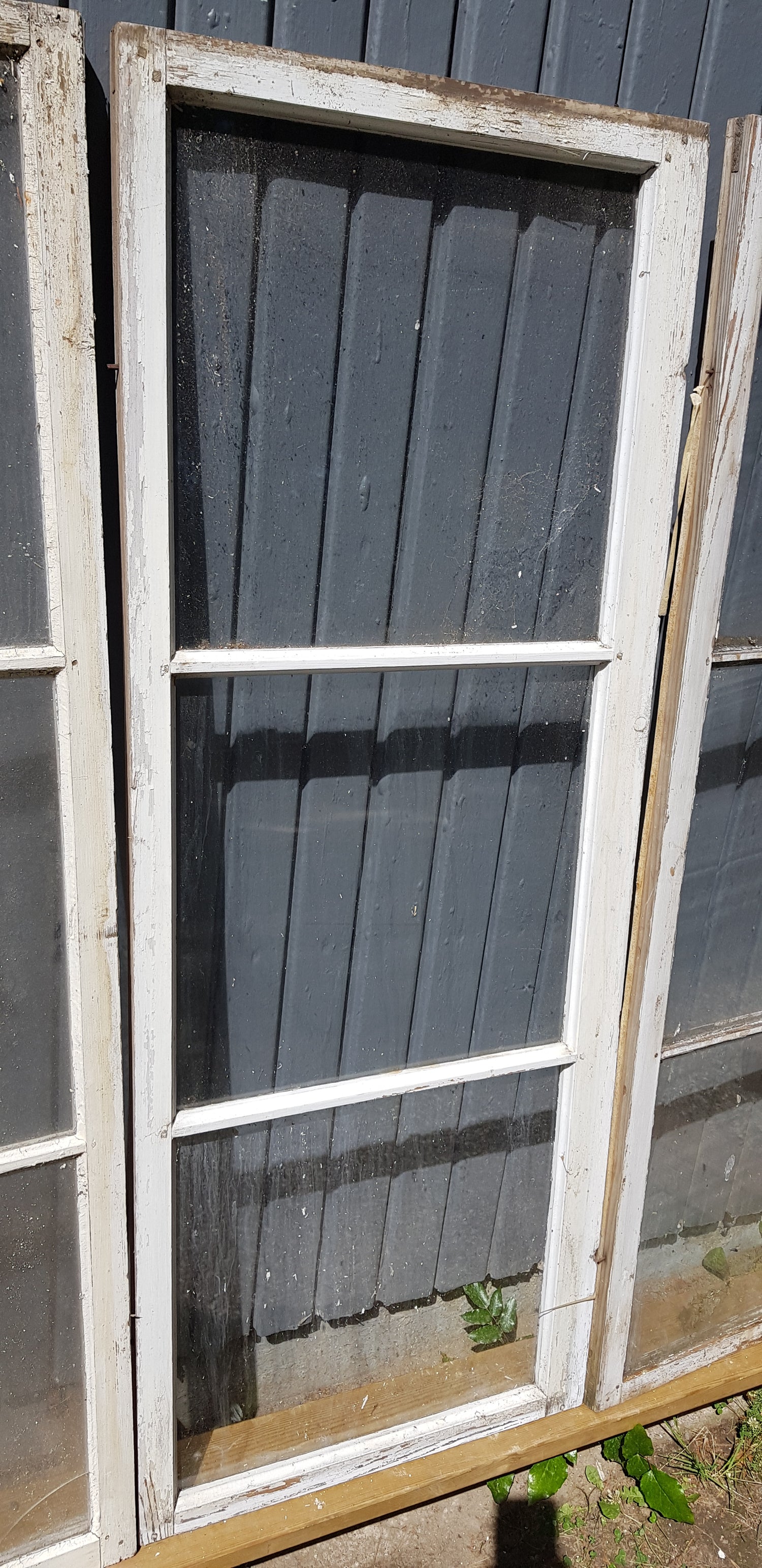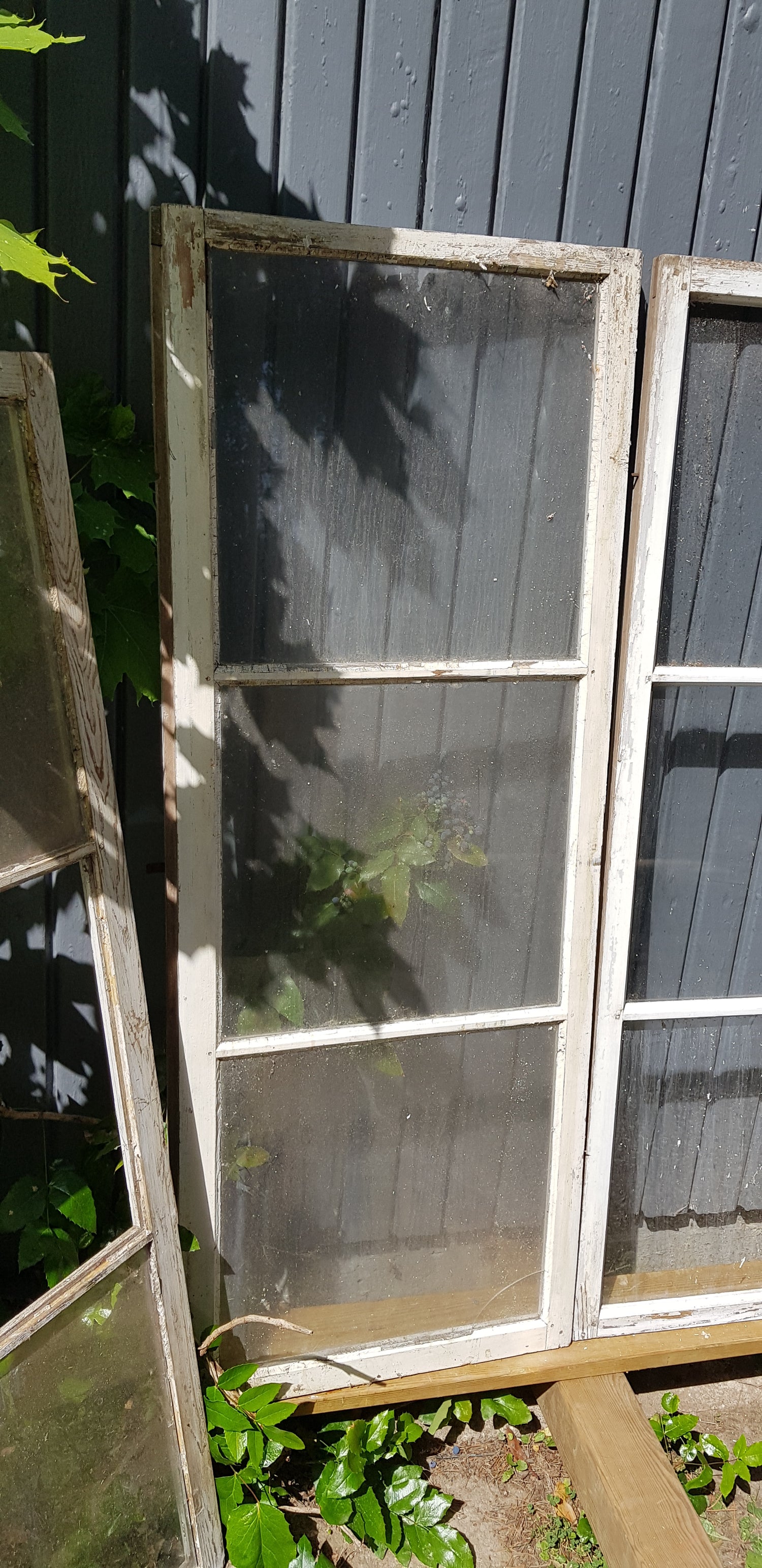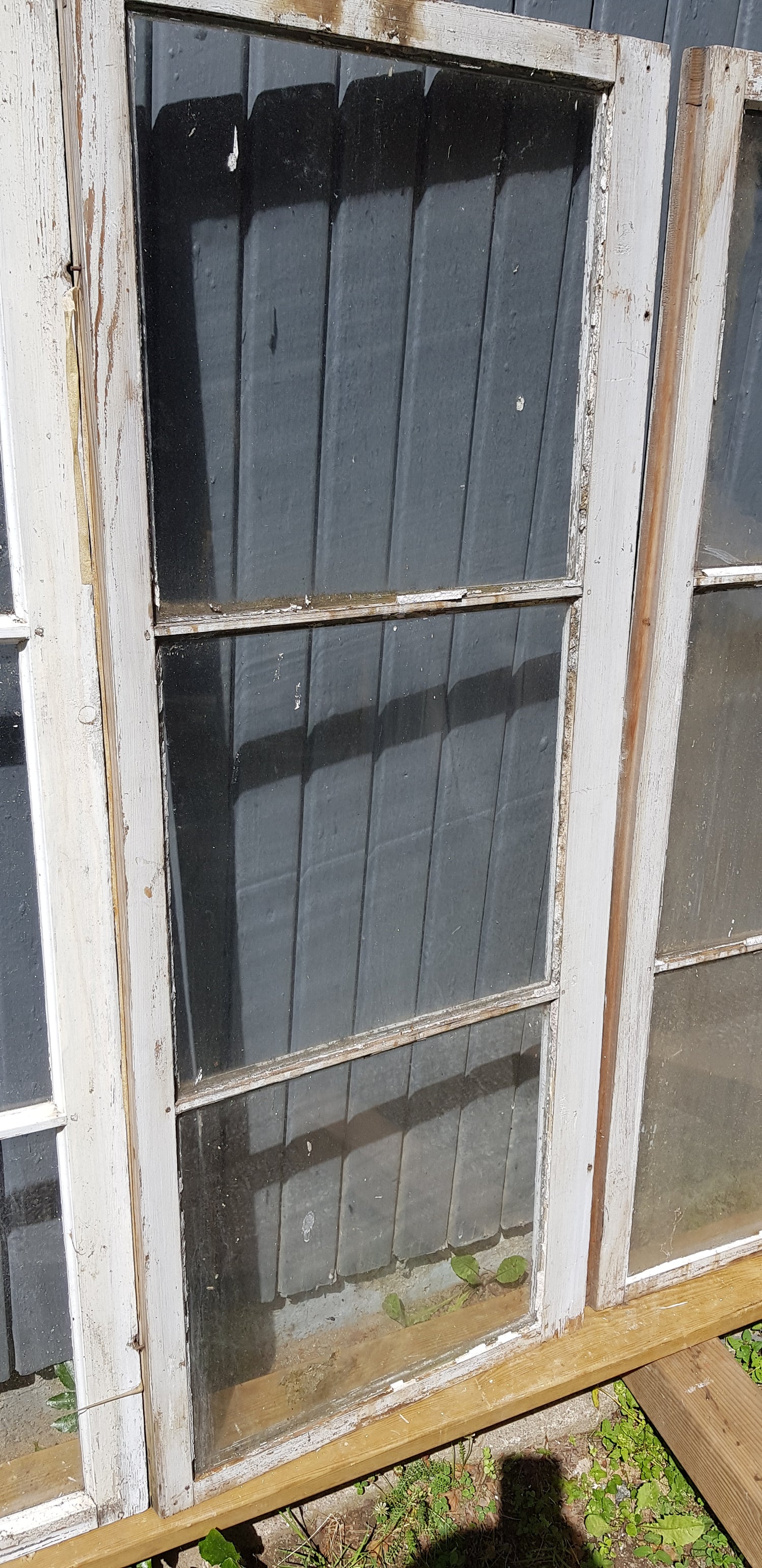 6 st Äldre spröjsade fönster med äkta spröjs utan karm med munblåsta glas. Perfekt till växthus eller uterum. Mått: Bredd 50 cm Höjd 130.5 cm tjocklek 2.5 cm