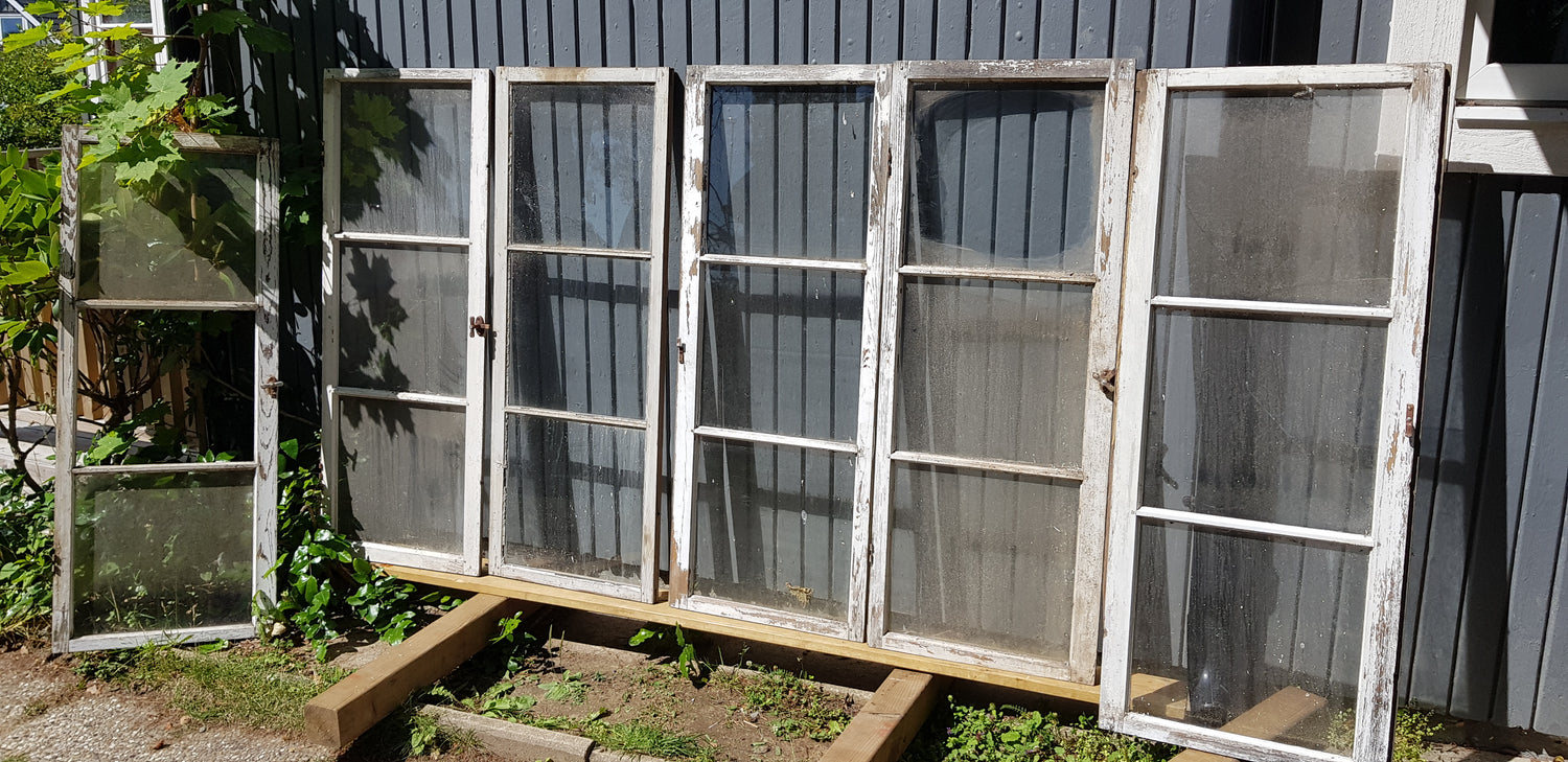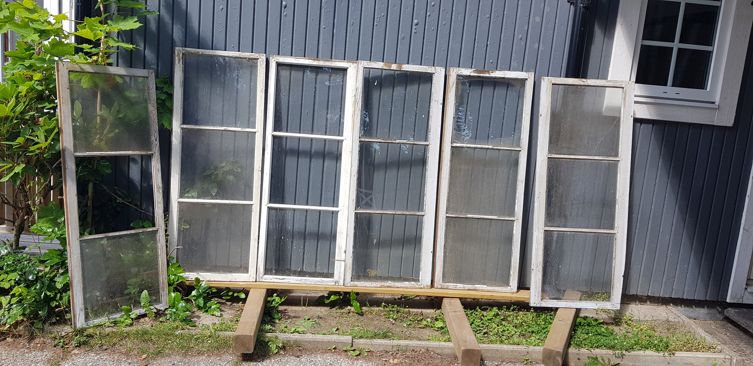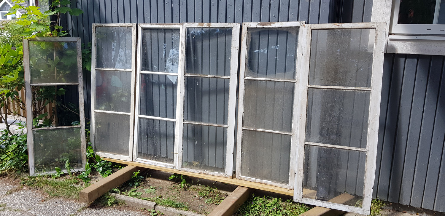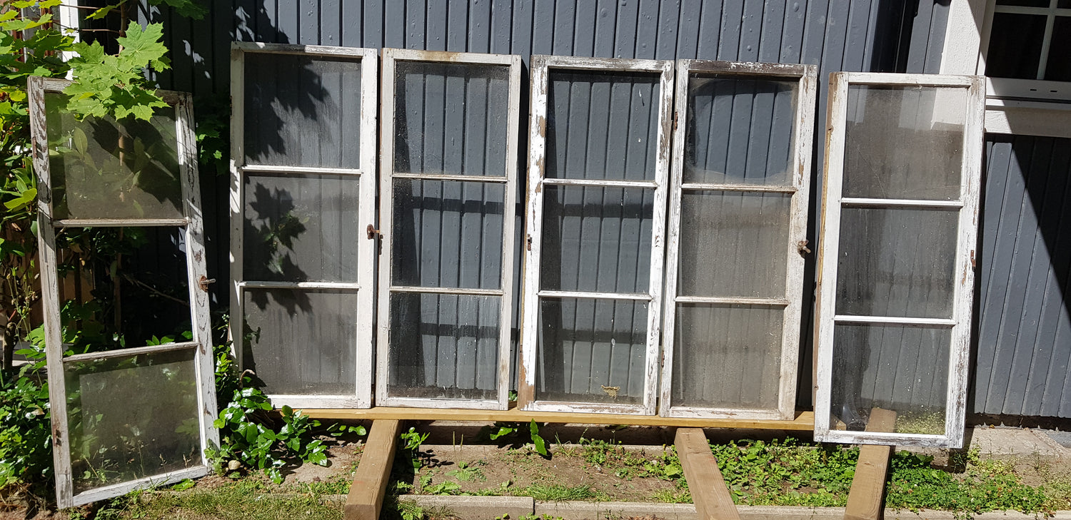 6 st Äldre spröjsade fönster med äkta spröjs utan karm med munblåsta glas. Perfekt till växthus eller uterum. Mått: Bredd 50 cm Höjd 130.5 cm tjocklek 2.5 cm