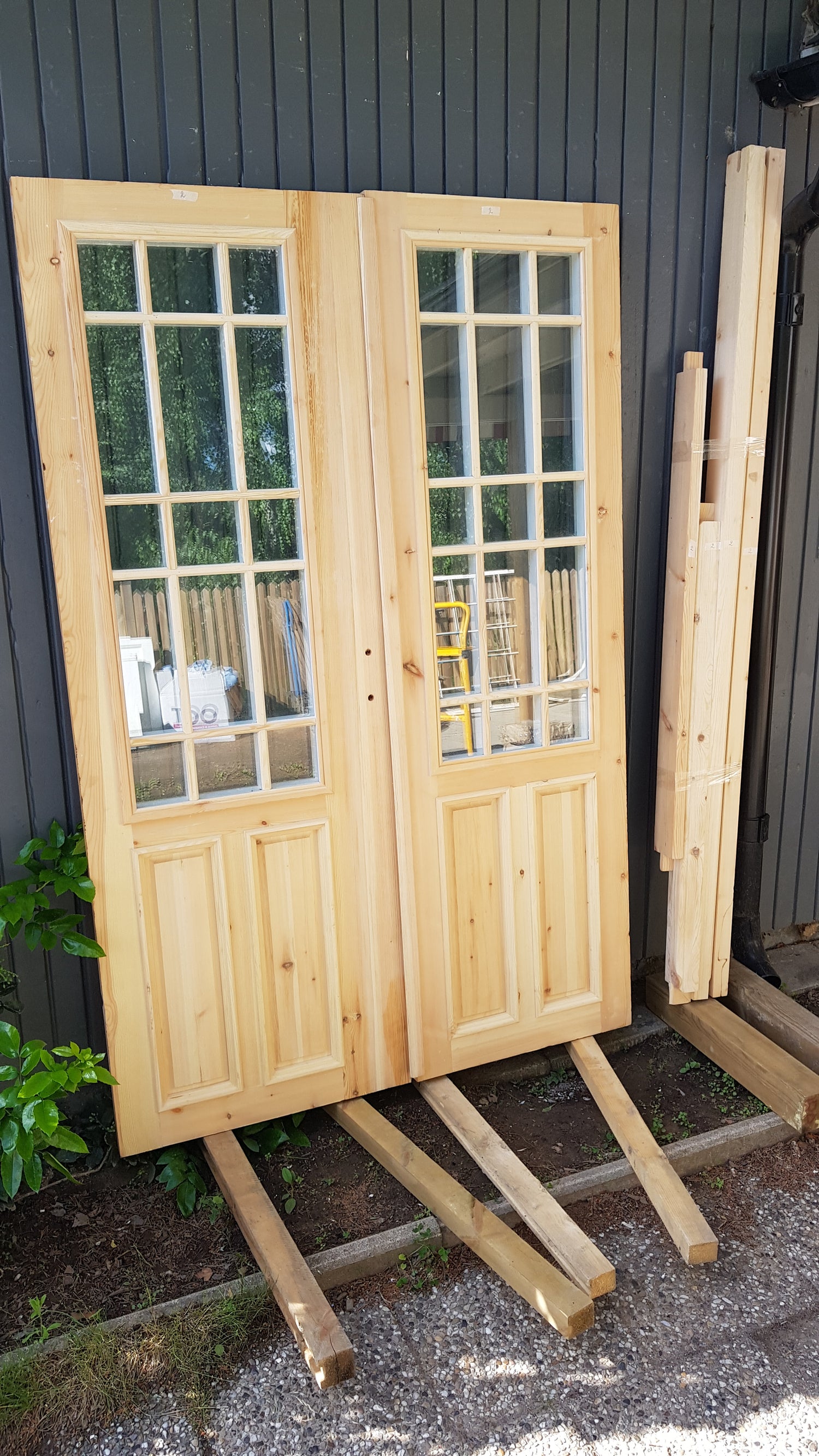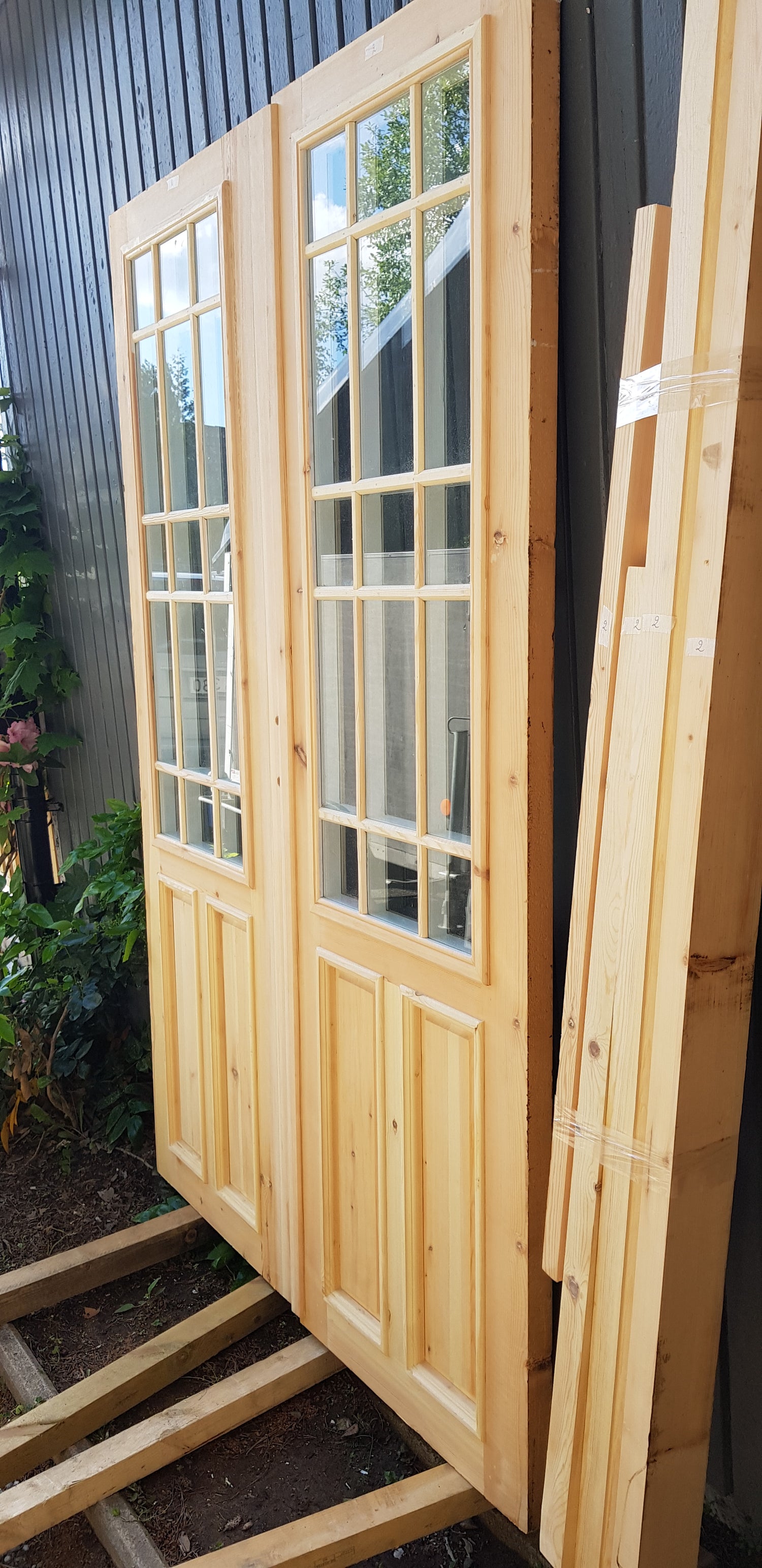 Art 33P Ny pardörr i gammal stil med dubbelt glas inklusive karm B140 cm H210 cm pris: 17000 kr