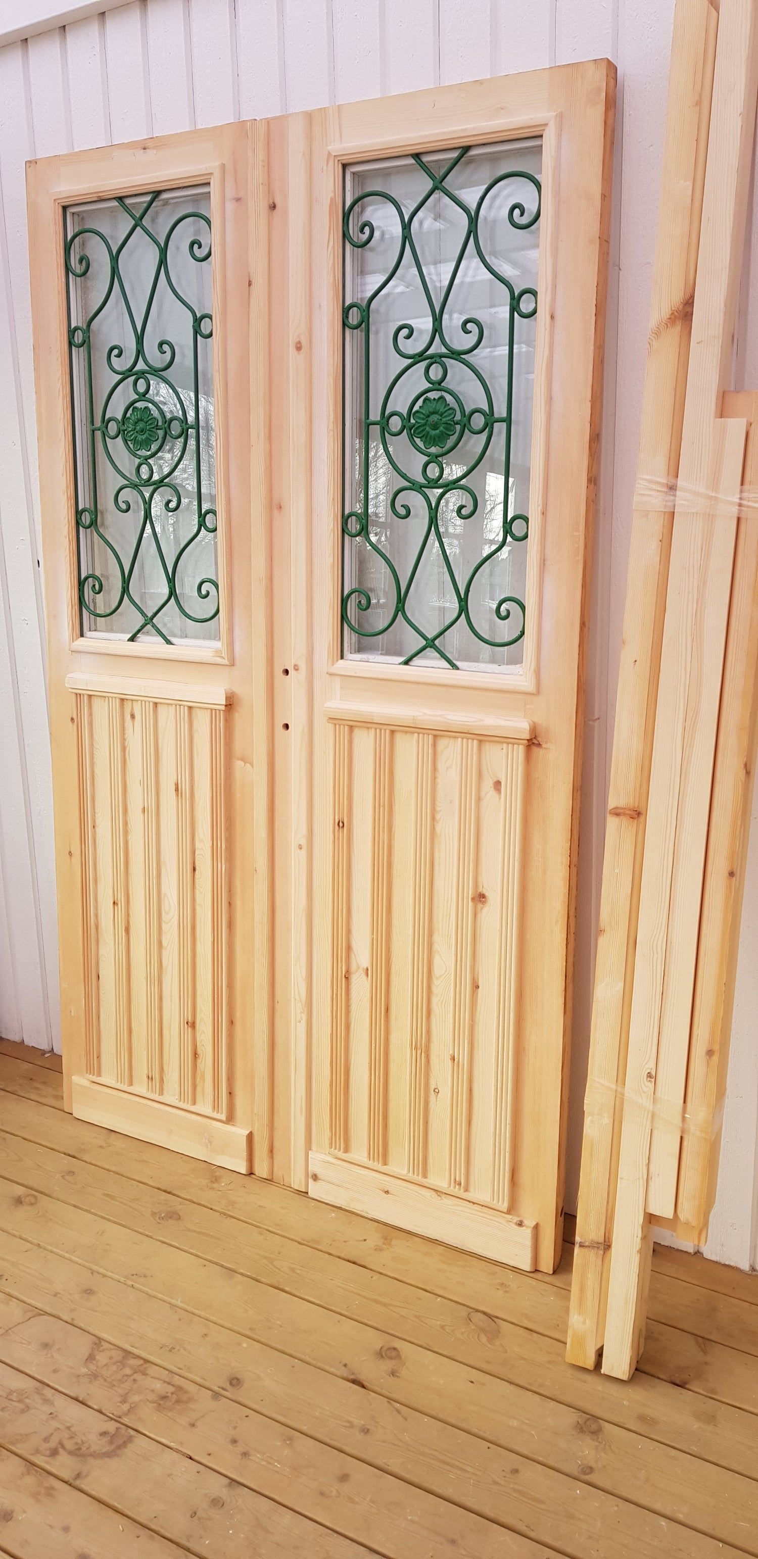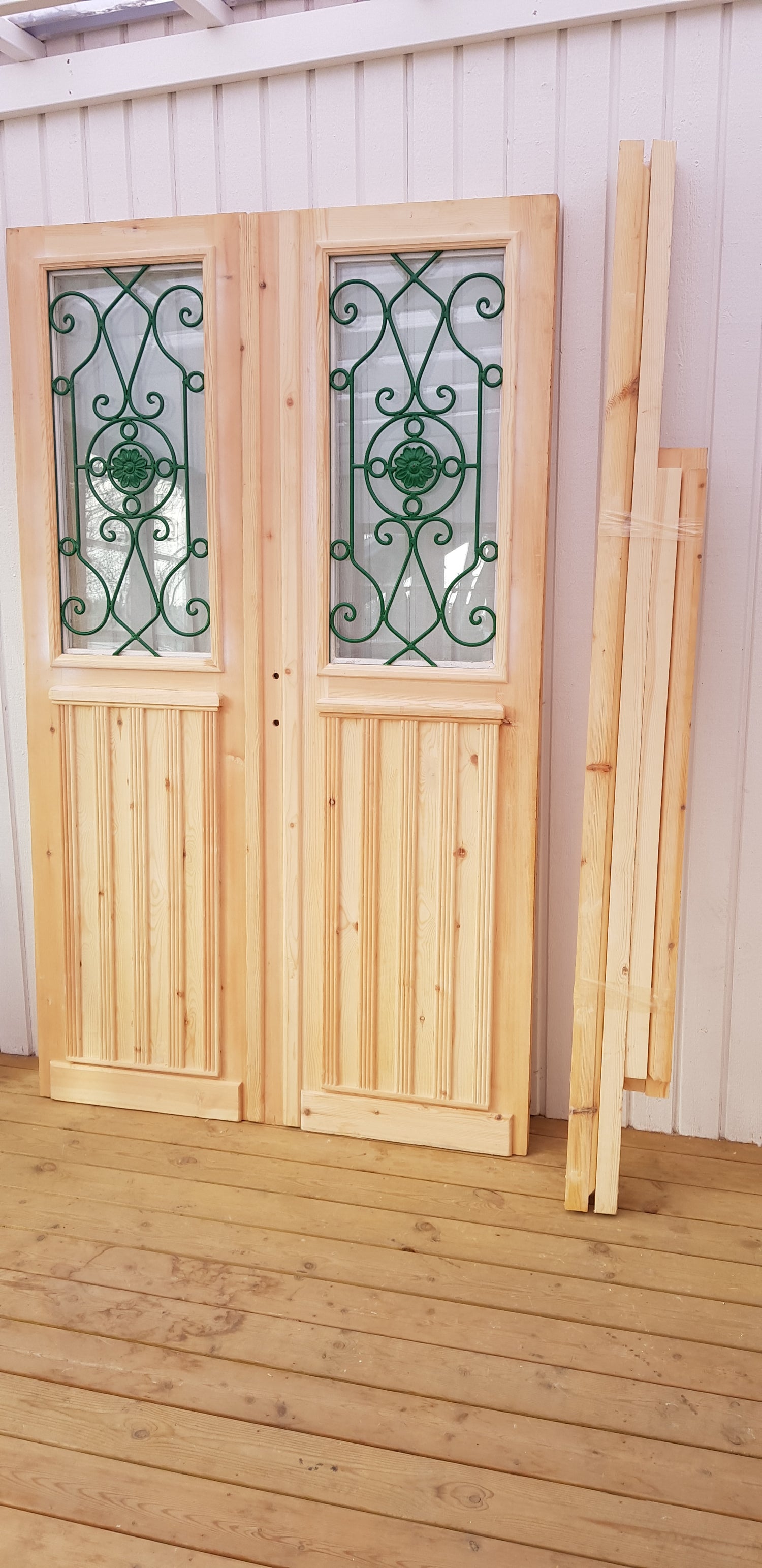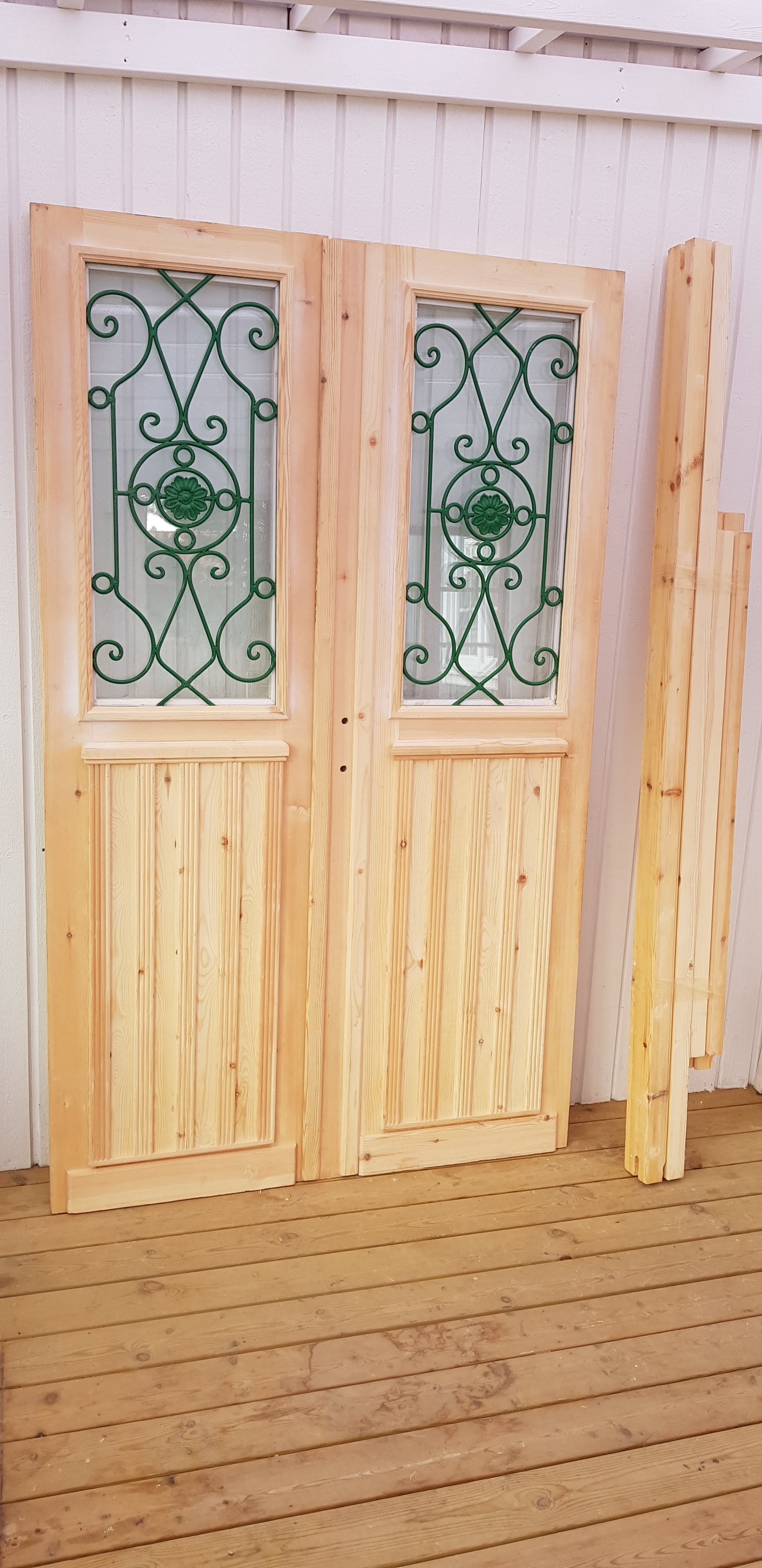 Art 33V Ny pardörr i gammal stil med dubbelt glas inklusive karm B130 cm H210 cm BR 110 cm pris: 19000 kr